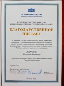 В Москве Николаю Войткову вручили благодарственное письмо Государственной Думы Российской Федерации за активное участие в общественной жизни, поддержку ветеранов и участников специальной военной операции, а также за вклад в патриотическое воспитание молодежи, формирующиеся у подрастающего поколения глубокую любовь к Родине и верность национальным интересам.