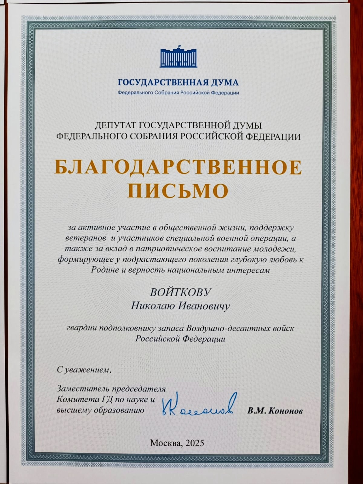 В Москве Николаю Войткову вручили благодарственное письмо Государственной Думы Российской Федерации за активное участие в общественной жизни, поддержку ветеранов и участников специальной военной операции, а также за вклад в патриотическое воспитание молодежи, формирующиеся у подрастающего поколения глубокую любовь к Родине и верность национальным интересам.