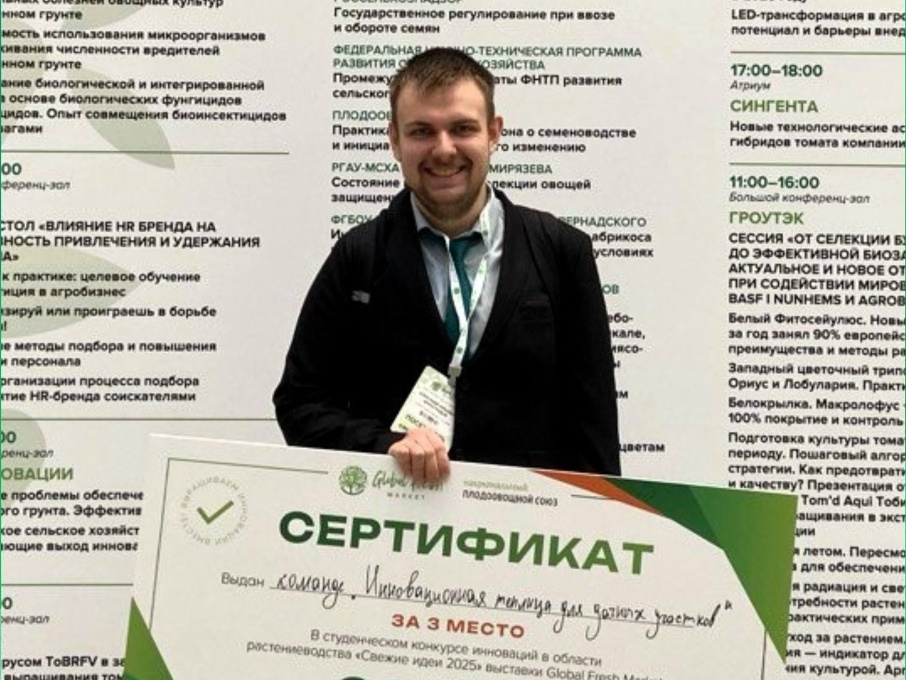 Магистр первого курса инженерного факультета РГАТУ имени П.А.Костычева Александр Виноградов занял III место в студенческом конкурсе инноваций в области растениеводства «Свежие идеи 2025».