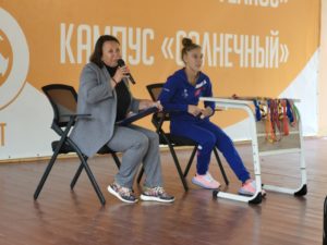 В начале встречи была проведена традиционная «Зарядка с чемпионом». Вместе с Мариной ребята выполнили несколько несложных физических упражнений, которые позволили быстрее настроиться на беседу.