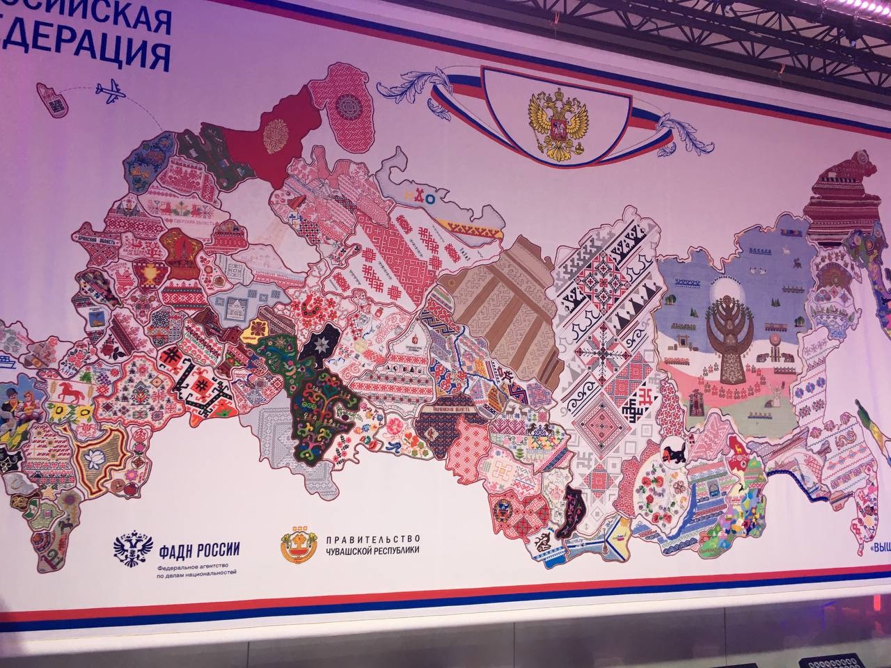В создании гигантского панно участвовали более 200 мастериц. Они вышивали традиционные узоры, которые повторяют географические очертания областей, краев, республик, округов и городов.