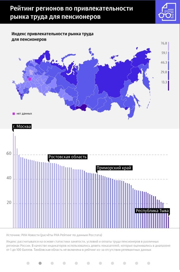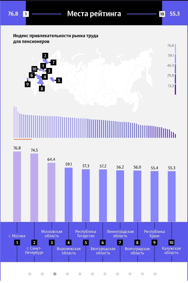 Всего было оценено 84 региона, причем высшей оценки – ста баллов – ни один из них не получил. В первую тройку вошли Москва – 76,8 балла из ста, Санкт-Петербург – 74,5, Московская область – 64,4. В десятке лидеров – Воронежская, Белгородская, Ленинградская, Волгоградская, Калужская области, Крым и Татарстан. В этих субъектах люди, достигнув пенсионного возраста, продолжают работать и получать приличную зарплату. Если они лишаются места, то без проблем находят новую вакансию.