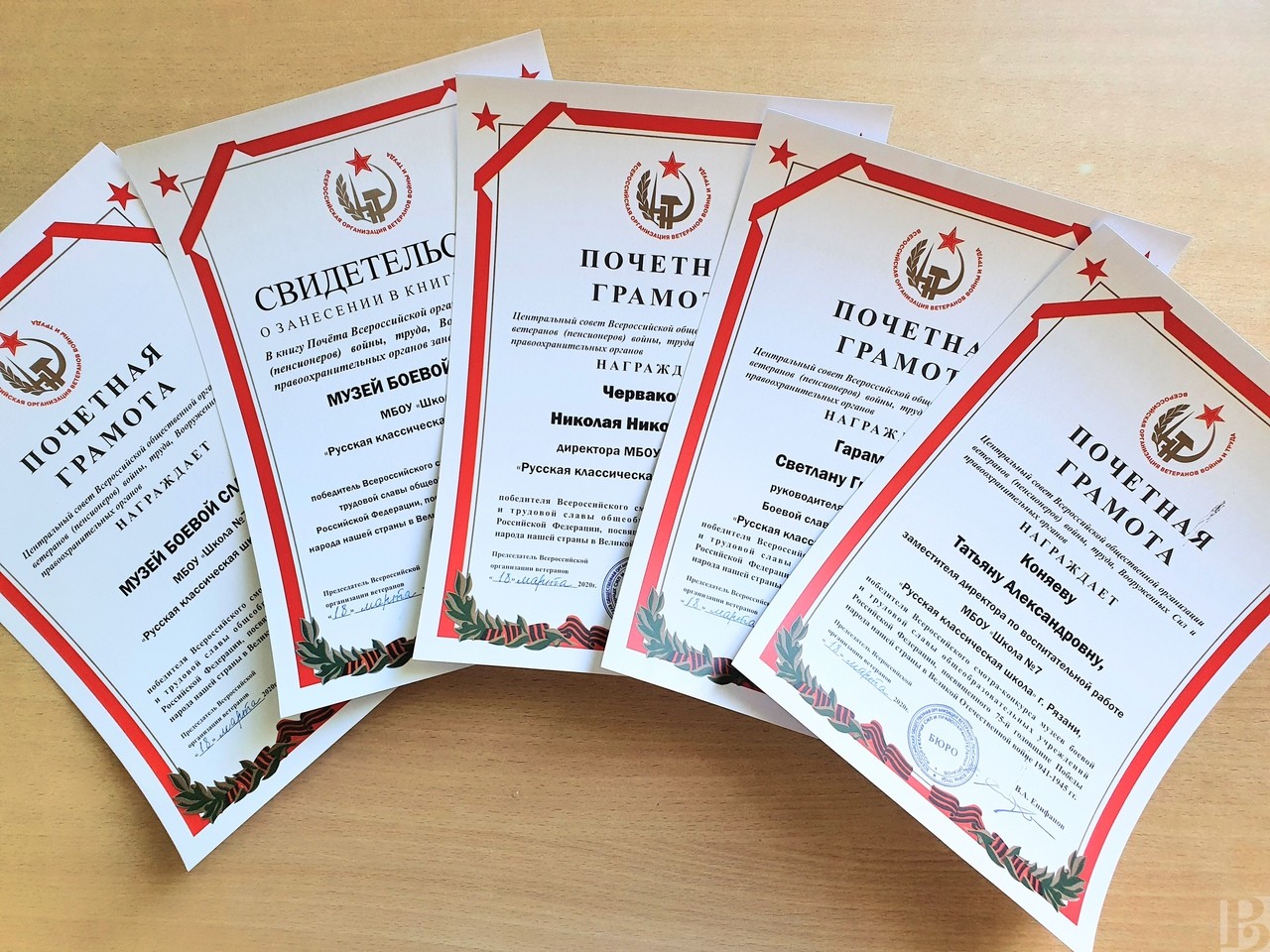 Школе вручено свидетельство о занесении музея боевой славы 7-й школы в Книгу памяти Всероссийской общественной организации ветеранов.