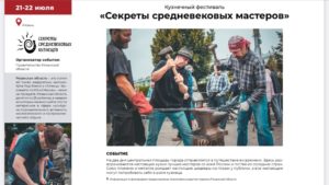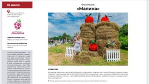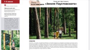 На 89 страницах представлена информация из 35 регионов страны. От Рязанской области представлены ленд-арт фестиваль «Земля Паустовского», фестиваль «Малина», фестиваль «Секреты средневековых мастеров», гастрономический фестиваль «Рязанское гостеприимство».