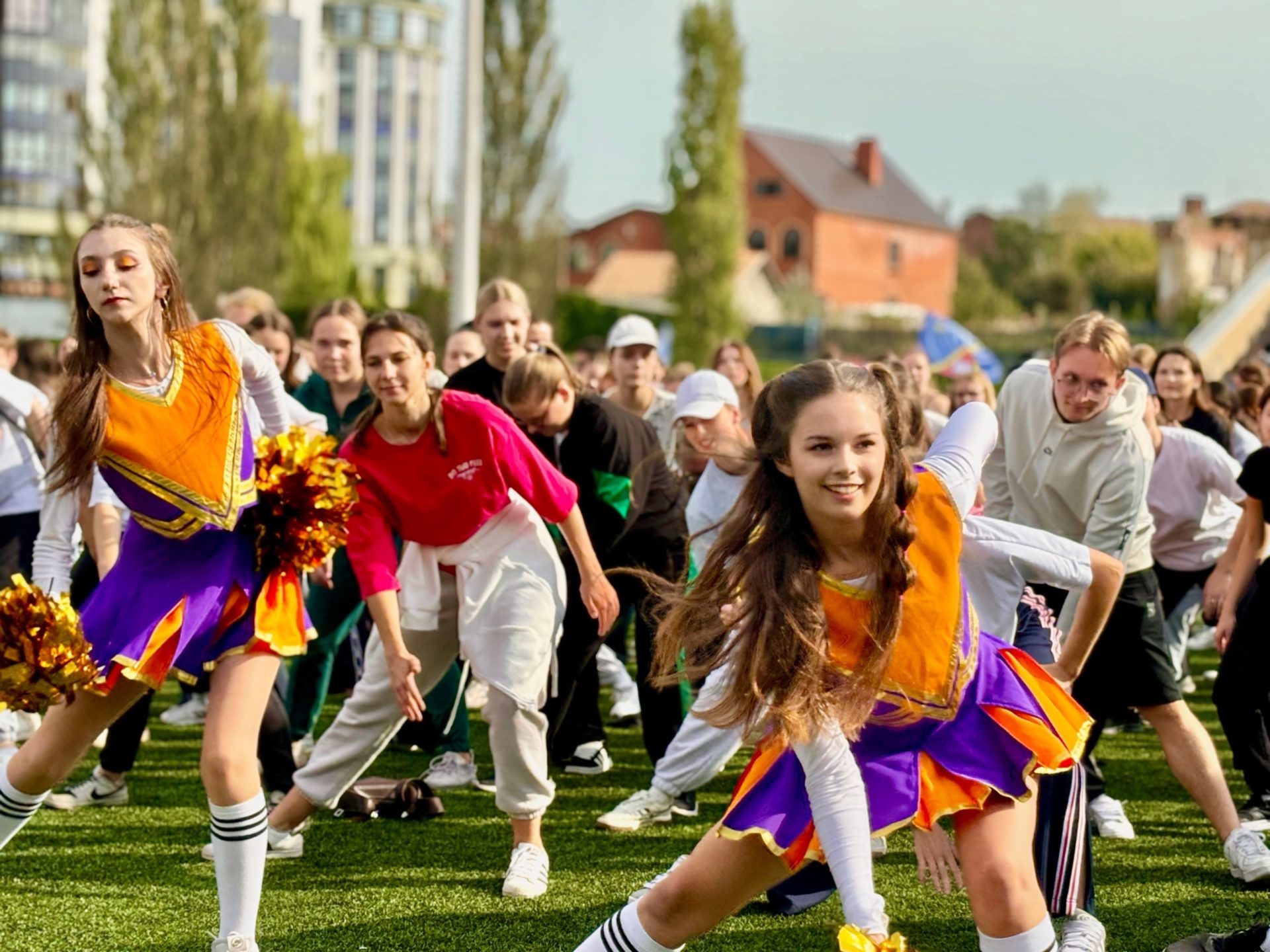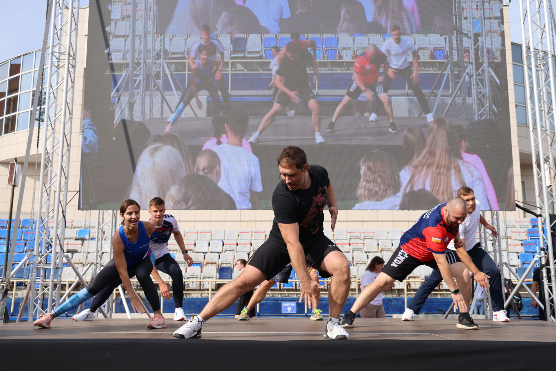 Молодые рязанцы повторяли движения за известными фитнес-тренерами города и спортсменами: Иваном Кулаковым – мастером спорта международного класса и преподавателем физкультуры в РязГМУ, Матвеем Арсеновым – мастером спорта по гребле на байдарках на каноэ, многократным победителем и призером чемпионата России.