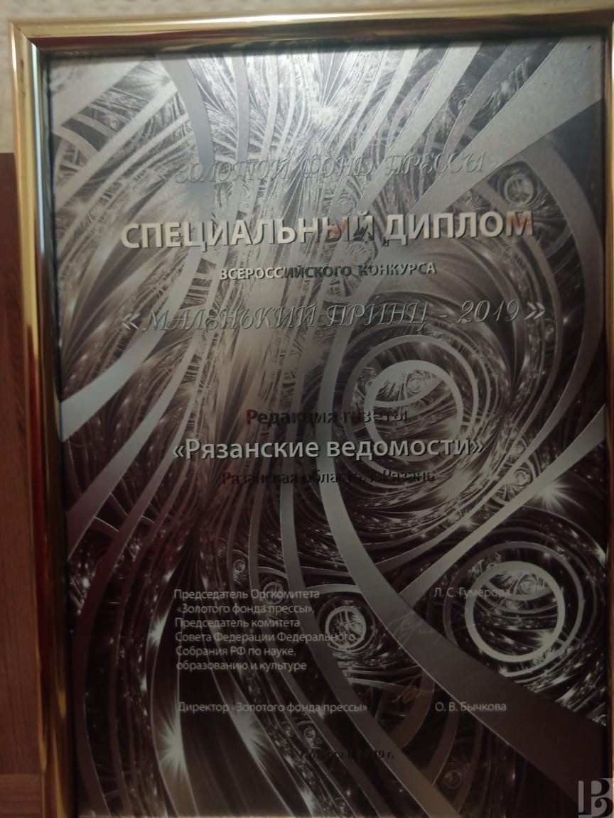 Специальный диплом «Рязанским ведомостям» вручён по итогам конкурса «Маленький принц». Этой награды удостоена детская страничка «Ведомостёнок» в пятничном выпуске газеты.