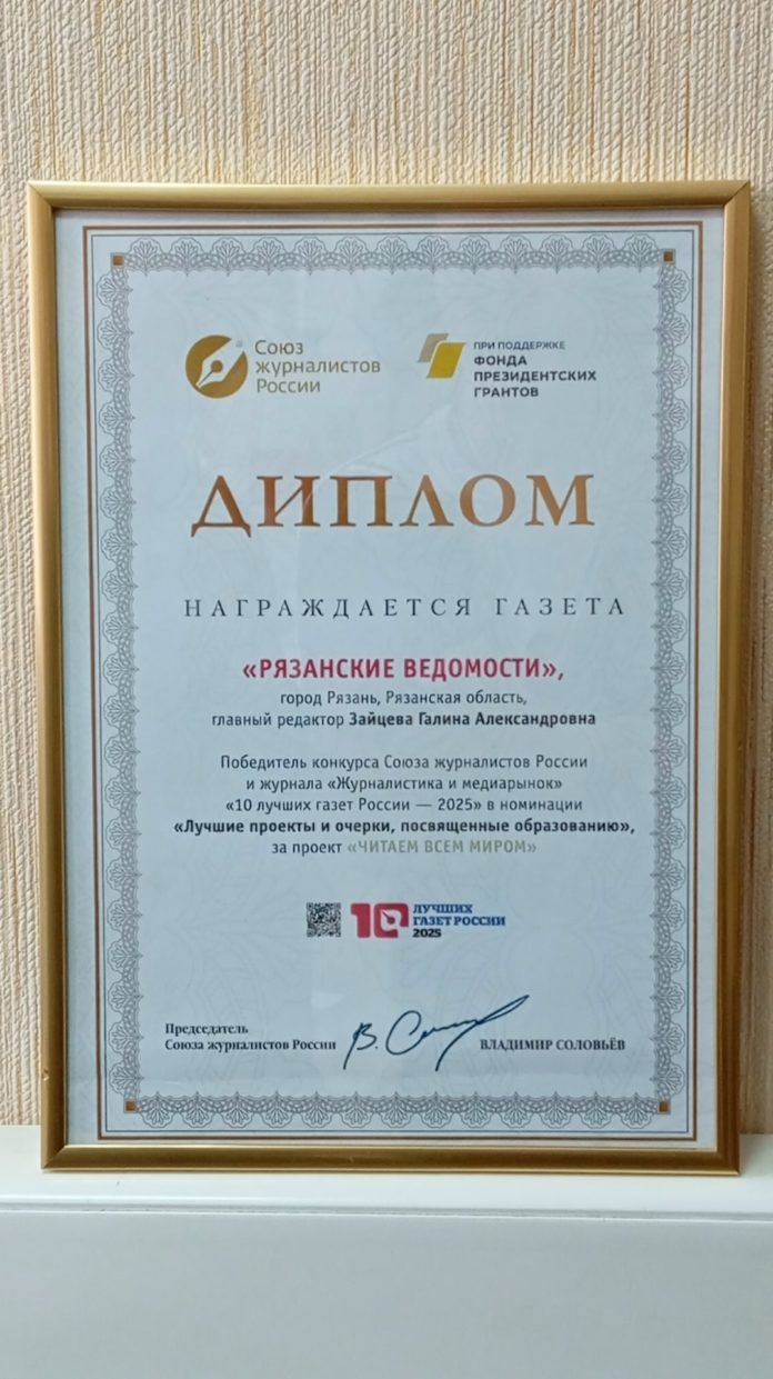 Газета «Рязанские ведомости» стала победителем конкурса Союза журналистов России и журнала «Журналистика и медиарынок» «10 лучших газет России – 2025» в номинации «Лучшие проекты и очерки, посвященные образованию» за проект «Читаем всем миром».