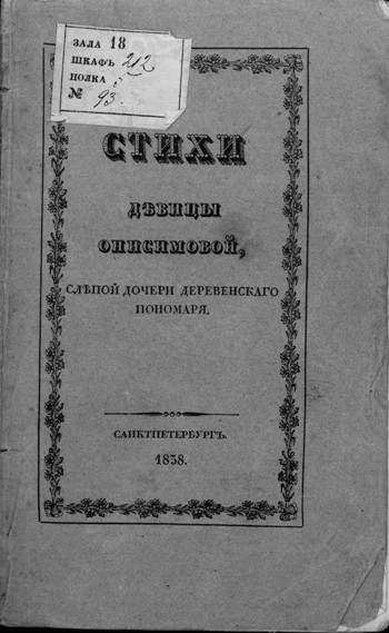 Дебютный сборник поэтессы вышел под пространным названием: «Стихи девицы Онисимовой, слепой дочери деревенского пономаря, сообщенные в Императорскую Российскую Академию и от нее изданные. Печатано по определению Императорской Российской Академии 8 января 1838 г.».