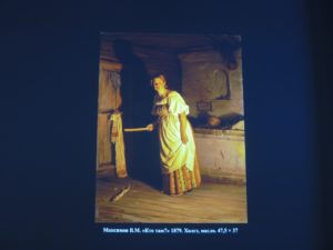 На картине изображена девушка, которая слышит, что к ней в дом стучится неизвестный. «Дверь закрыта ухватом, поблизости лежит полено, сама девушка держит в руках рубель. Все это создает впечатление того, что ей страшно. Со звуком картина приобретает более зловещий окрас. К тому же в дальнейшем героиня поворачивается лицом к аудитории. И да, на нем отчетливо читается испуг», – поделилась специалист.
