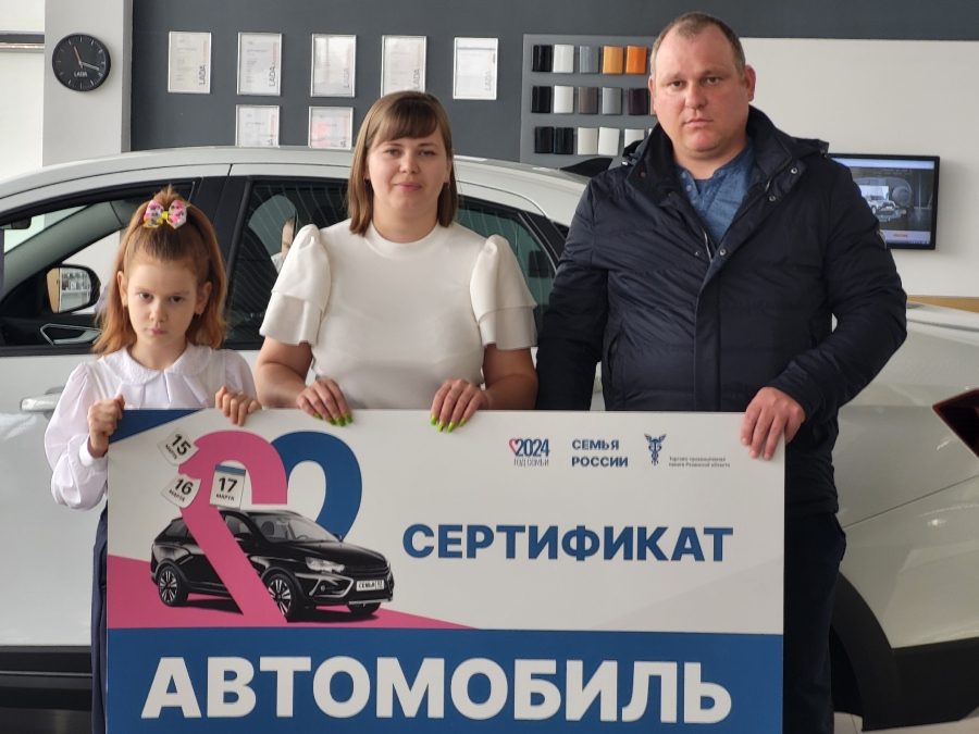 Победителям социального проекта «Семья России» вручили ключи от автомобилей. Среди обладателей «Весты» – Анастасия Владимировна Кузнецова из села Студёнки Александро-Невского района. В Рязань за получением выигрыша она приехала с мужем Василием Владимировичем и 10-летней дочкой Алёной. Супруги работают в ООО «Мир».
