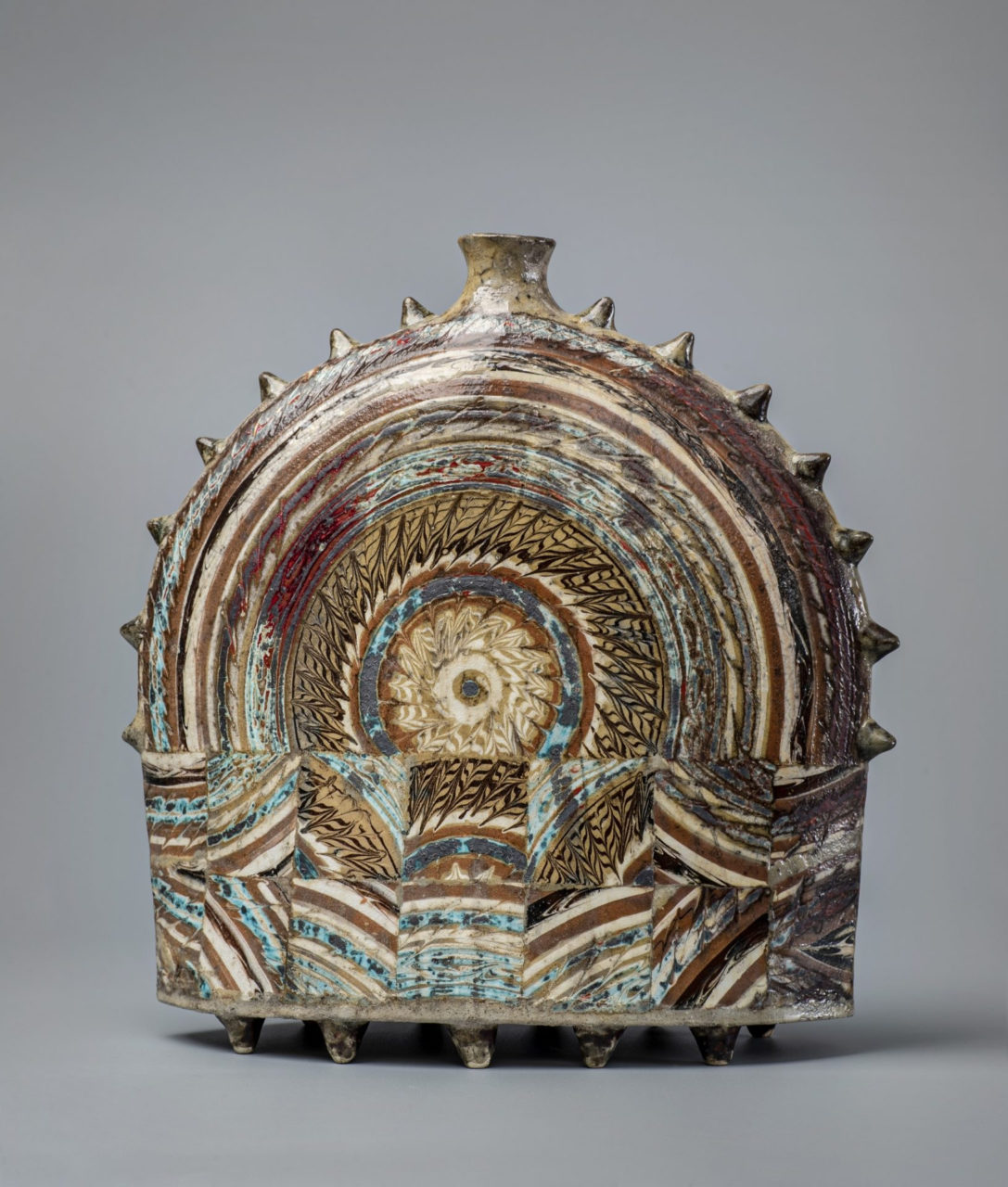 На фото: Т. Пивоварова.Урожайный год. 2016. Бумага, акварель. 53 × 72; Н. Блинова “Разве у вас не бывает в жизни подобных минут”. 2019. Картон, темпера, карандаш. 70 × 89,8; Г. Сметанина Ваза «Северное солнце» Серия “Солнечные мозаики” 2015. Глина, ангобы, глазурь, восстановительный обжиг. 33 × 33 × 15