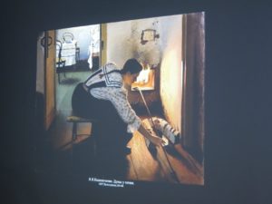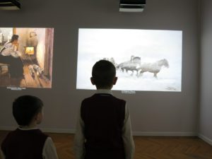 В этот раз выставку посетили ученики второго класса рязанской школы №36. Когда на их глазах картины начали оживать, то маленькие посетители были в восторге. Особенно сильные эмоции у ребят вызвало полотно Николая Каразина «Метель», на котором изображена упряжка лошадей, бегущих по снегу. Ни у одной из картин нет рамок, чтобы зритель мог полностью погрузиться в картину и прочувствовать ее атмосферу.