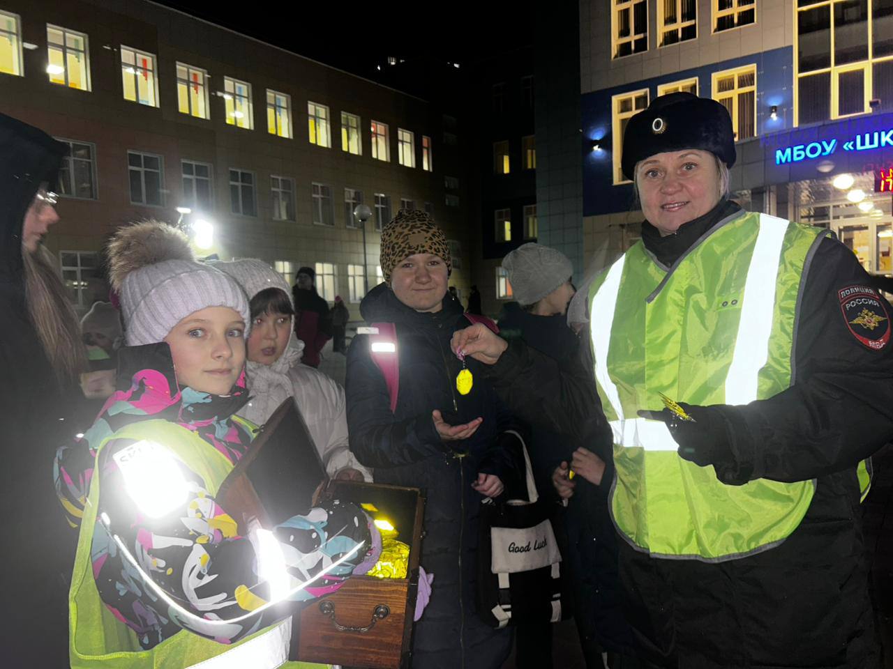 Участники акции получили в подарок светоотражатели и прикрепили их на куртки, сумки, рюкзаки.
