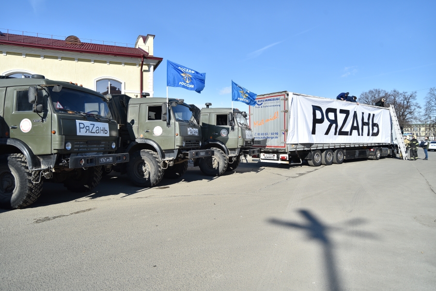 80 тонн гуманитарных грузов отправились из Рязани в Белгородский распределительный пункт, откуда их доставят на территорию Донбасса и Украины. Гуманитарную помощь собрали рязанские агрофирмы и промышленные предприятия. Десять большегрузных автомобилей проводил в путь губернатор Николай Любимов и представители регионального правительства.