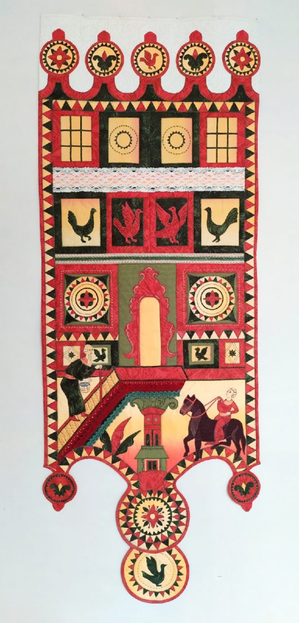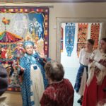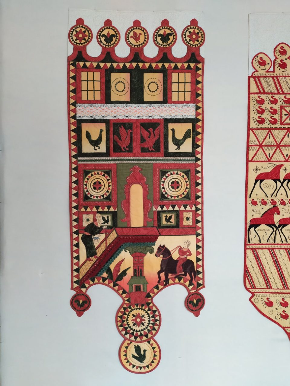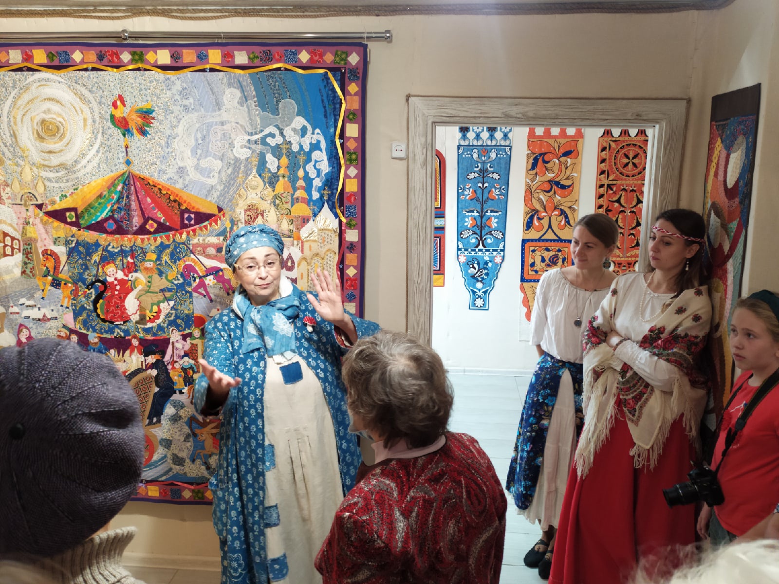 Директор музея “Шили-Были” Елена Венедиктова провела экскурсию по выставке для гостей. Она рассказала, как основательница “Лоскутного острова” Ольга Андреева увидела в местном краеведческом музее деревянные прялки. Мастерицы решили детально повторить эти экспонаты в своих работах, а там, где роспись и декор были утрачены, восстановили их. В экспозиции представлены 13 панно, изображающих прялки с городецкой росписью и чертами других промыслов России.