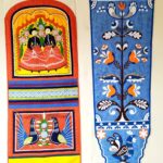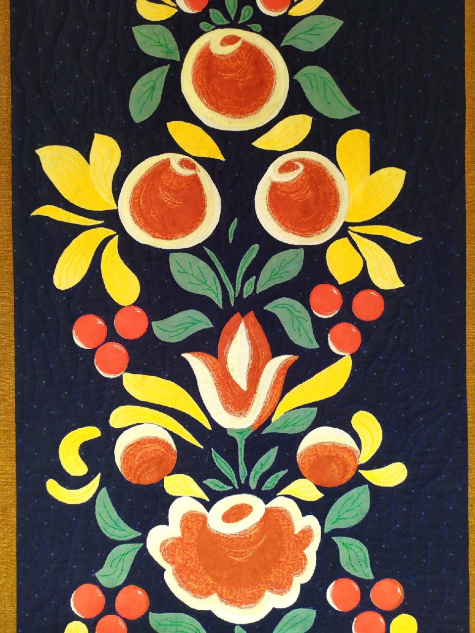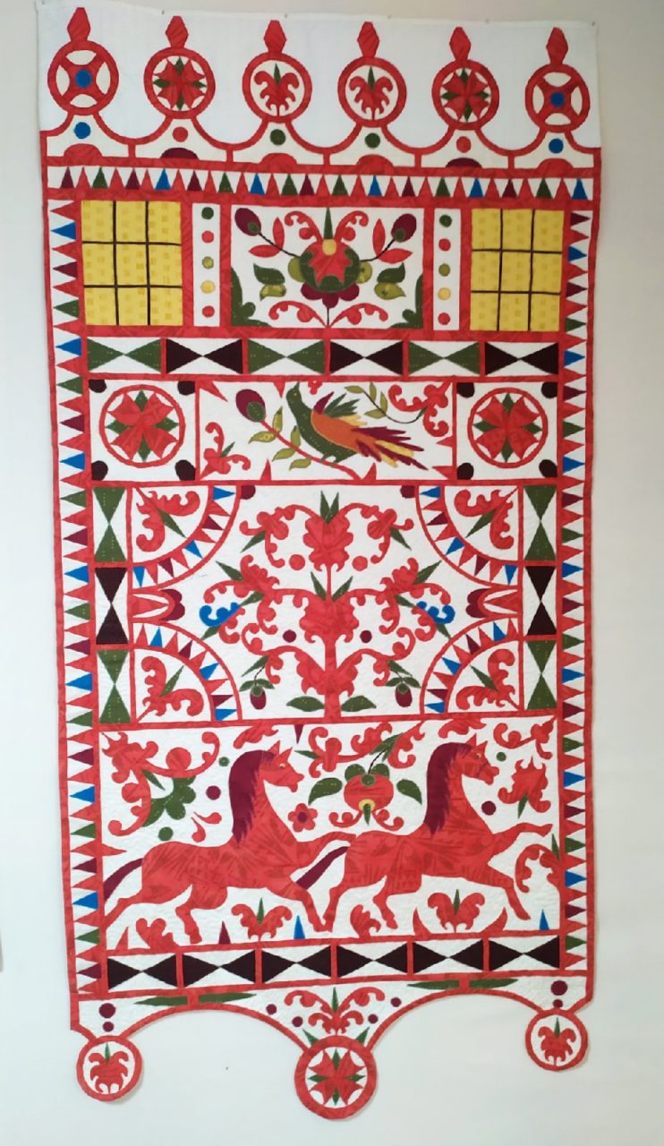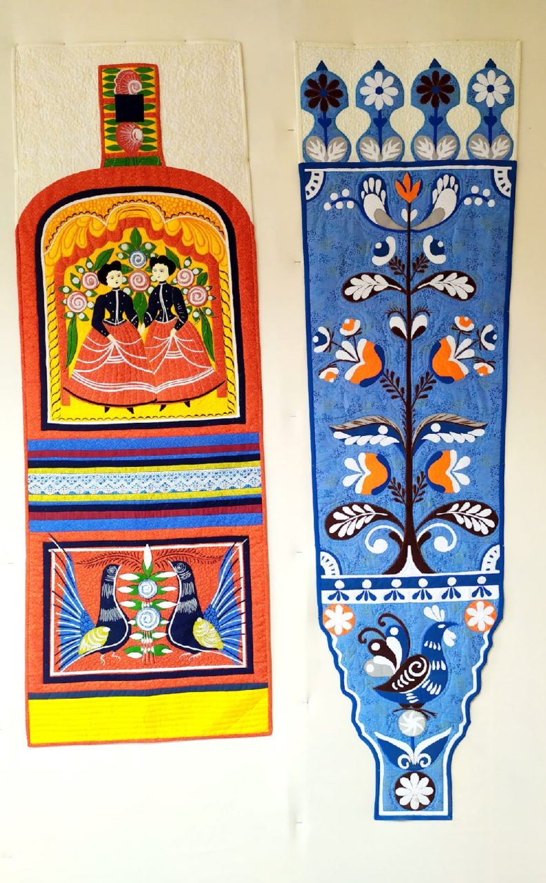Директор музея “Шили-Были” Елена Венедиктова провела экскурсию по выставке для гостей. Она рассказала, как основательница “Лоскутного острова” Ольга Андреева увидела в местном краеведческом музее деревянные прялки. Мастерицы решили детально повторить эти экспонаты в своих работах, а там, где роспись и декор были утрачены, восстановили их. В экспозиции представлены 13 панно, изображающих прялки с городецкой росписью и чертами других промыслов России.
