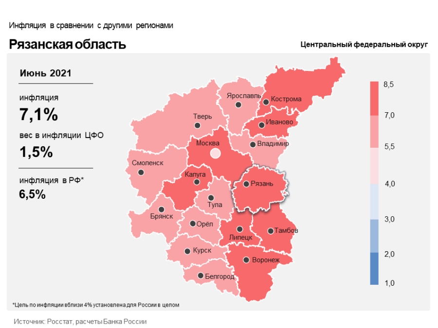 Сегодня инфляция в России растет по широкому кругу товаров, в Рязанской области по итогам сентября она составила 8,1%. Каждый месяц рязанское отделение на своей странице на сайте Банка России дает развернутый информационно-аналитический материал об инфляции в регионе, где можно узнать, как изменились цены на товары, а главное – почему это произошло.