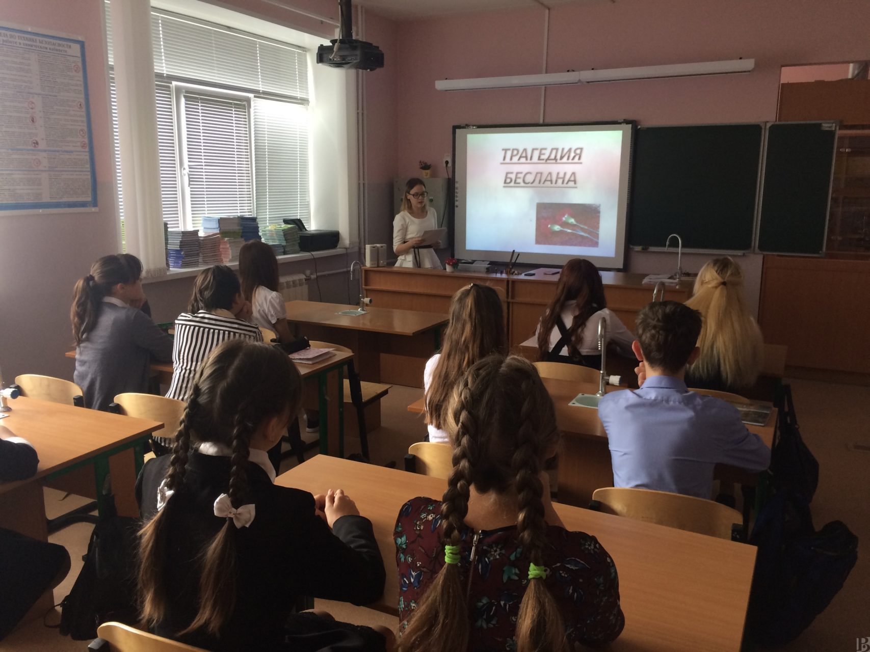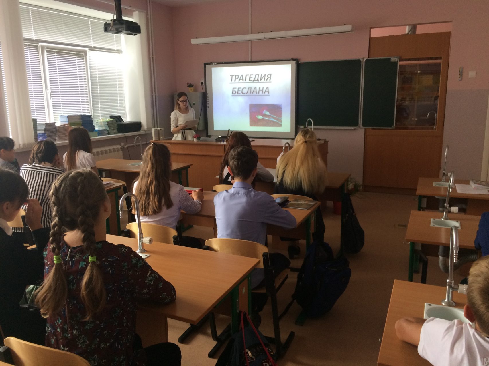 В младших классах прошли внеклассные беседы «Дорогой мира и добра». Старшеклассники написали сочинения на тему «Трагедия Беслана».