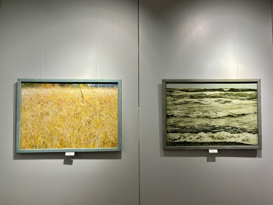 В третьем зале краски разливаются по полотнам и дают нам ощутить всю длину видимого света. Денис представил портреты и пейзажи маслом. После двух залов графических решений эти сочные цвета кажутся выкрученными на максимум. Здесь бьет лазурно-мыльный шторм в Витязеве и наливается солнцем жатва. От «Высокой влажности октября» тянет мхом и лишайником, а картина «Снег уже сошел с кирпича» дарит первые брызги холодного ручья. Люди на картинах тоже есть. Вот пожилая женщина в вышиванке, алом сарафане и телогрейке. Правда, уголки ее губ, как и взгляд, опущены, призадумалась она чем-то, да так и запечатлел ее художник. Есть здесь и образ рабочего из Средней Азии – его запыленный воротник, щеки и мочки ушей говорят о том, что в тот солнечный день мужчина потрудился на славу. А на автопортрете Денис будто бродит по заброшенному дому с дальним светом в оконце. Главное, свет там все-таки есть! Более того, он присутствует на каждом, даже черно-белом и самом крошечном полотне.