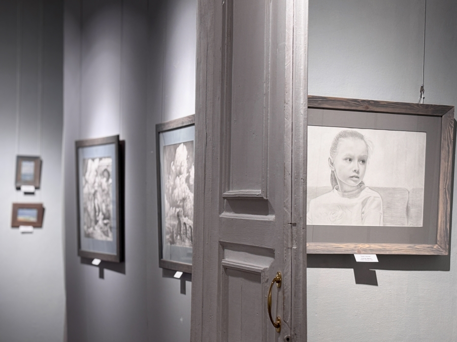 Войдя в первый зал, я попадаю в мир мягких карандашных штрихов – это произведения Лидии Черновой. Почему-то в них сразу чувствуется женская рука – с черно-белых полотен на меня смотрят статные лошади, нежные цветы и тихие парки. Линии тонкие, дымчато-прозрачные, едва касающиеся холста. По обеим сторонам зала – портреты внучек Лидии, дочерей Дениса. Слева на картине не по годам серьезная Мила, а справа – озорная и улыбчивая Иулитта.