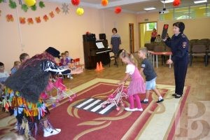 В гости к воспитанникам детского сада №136 Рязани пришли необычные гости – инспекторы ГИБДД и герои известной сказки «Домовенок Кузя и Баба-Яга».