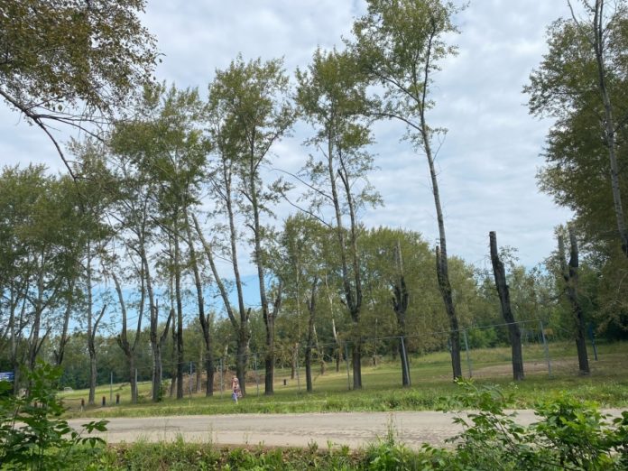 По периметру спортивной площадки и здания школы стоят ещё семь сухих остатков стволов бальзамического тополя с признаками усыхания. Декоративность этих деревьев утрачена, есть угроза обрушения, принято решение о вырубке. Ещё 27 тополей по периметру площадки нуждаются в жёсткой топпинговой обрезке. Работы по их вырубке продолжатся в течение этого года.