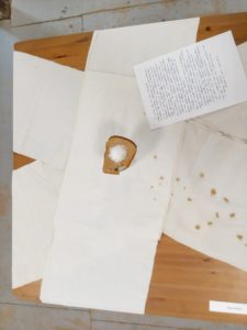 – Я попыталась показать кусочек своего детства. Мой дедушка умер задолго до моего рождения, и чтобы мне не было обидно от того, что у других есть дедушки, а у меня нет, бабушка в день рождения деда накрывала таким образом стол и говорила, что Бог отпустит его в этот день посмотреть на меня, как я выросла, и что дед этого дня очень ждет. Когда я просыпалась утром, то видела надкусанный хлеб, нарочито разбросанные крошки, чтобы я поверила в то, что он приходил. И я вправду верила в это и в то, что он существует. Теперь бабушки нет, я по ней очень скучаю. Я написала ей письмо.