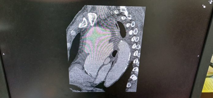 «Компьютерная томограмма подтвердила выпячивание аорты размером 9 на 9 сантиметров. Гигантская мешотчатая аневризма, больше, чем гусиное яйцо. Она сдавливала все близлежащие органы и ткани: трахею, бронхи, верхнюю полую вену. Уникальный случай. Аневризмы таких размеров встречаются не часто», – отмечает заведующий отделением №5 Рязанского кардиодиспансера Сергей Загородний.
