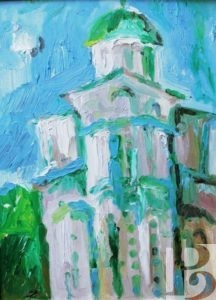 Наше путешествие начнется прямо у стен музея истории молодежного движения. Светло-розовое старинное здание имеет в реальности изящные, но довольно строгие очертания и привлекает туристов обаянием старины. Денис Исаев наводит на этот вид свою оптику и отражает на холсте собственные эмоции от визитов в музей. И все преображается: памятник архитектуры словно вибрирует в летнем воздухе, а буйная зелень деревьев и кустарников вокруг создает облик райского сада. Красноречивое название «Музей радости» показывает, сколько ярких впечатлений может получить человек от знакомства со своей историей. Главное – хотеть слушать и смотреть.