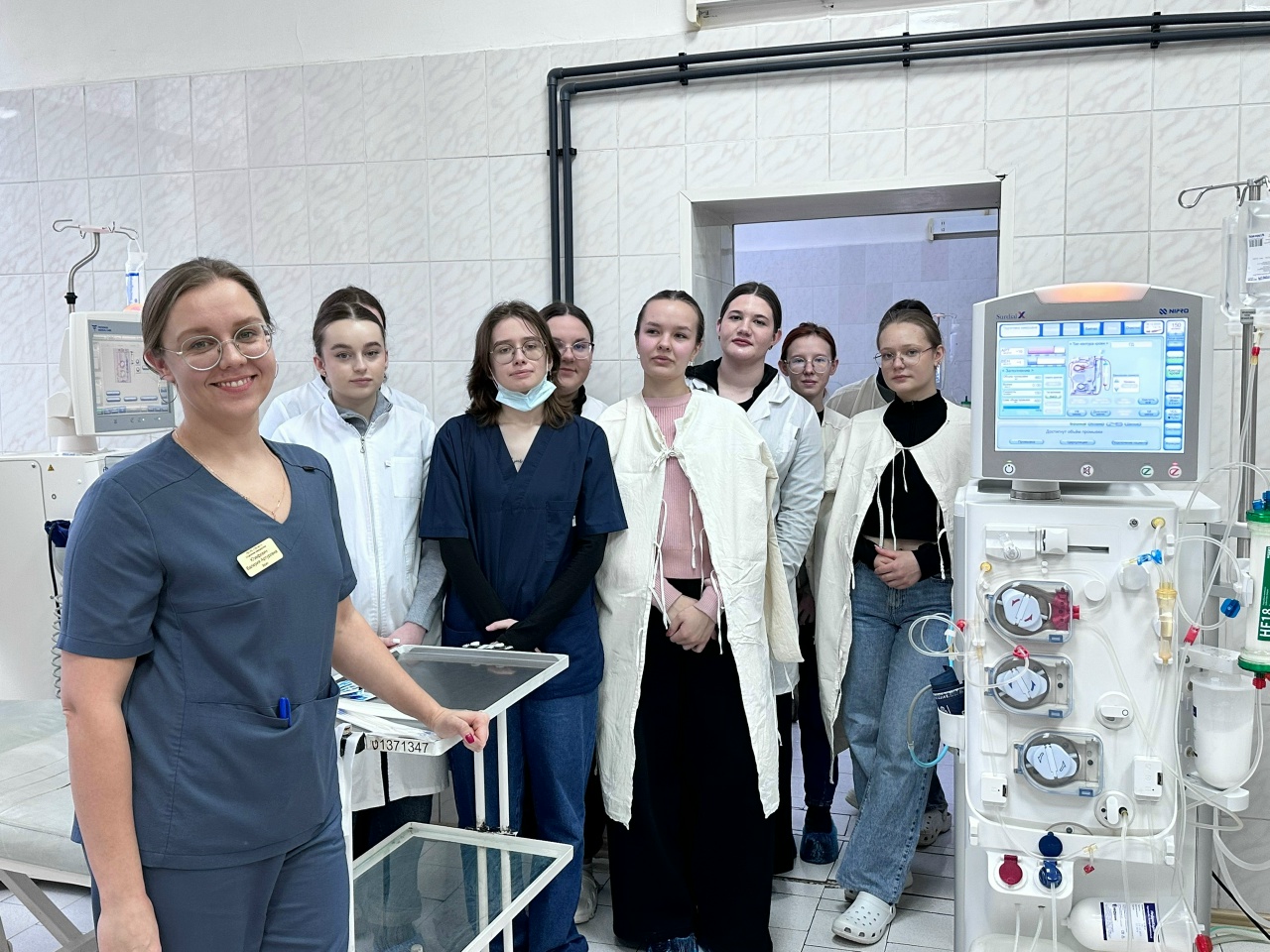 Встреча прошла в отделении гемодиализа. Студентам показали, как работают с пациентами с хронической почечной недостаточностью. Заведующая отделением Валерия Юзефович продемонстрировала будущим медицинским сестрам как работает аппарат «искусственной почки», как организована работа в отделении и ответила на вопросы студентов.
