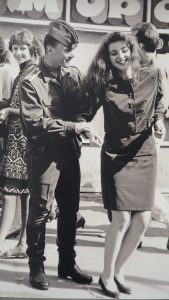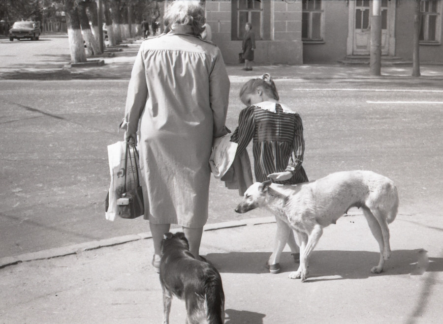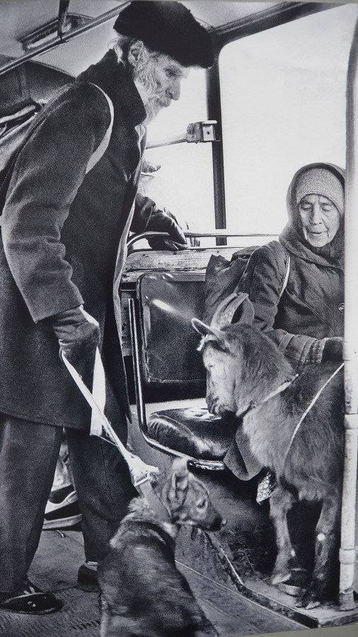 Нельзя пройти мимо снимка «Строгая мама» (1991 г). Рядом с ним несколько миниатюрных отпечатков из этой же серии – о том, что предшествовало финальному кадру. Бегает по улице собака, тычется носом в сумки прохожих. Идет мама с дочкой. Девочке явно хочется собаку приласкать, мама тянет ее дальше. Что-то сейчас произойдет! И вот он, этот миг: собака ластится к девочке со спины, и она, украдкой, изогнув ладонь, все-таки касается ласково ее холки.