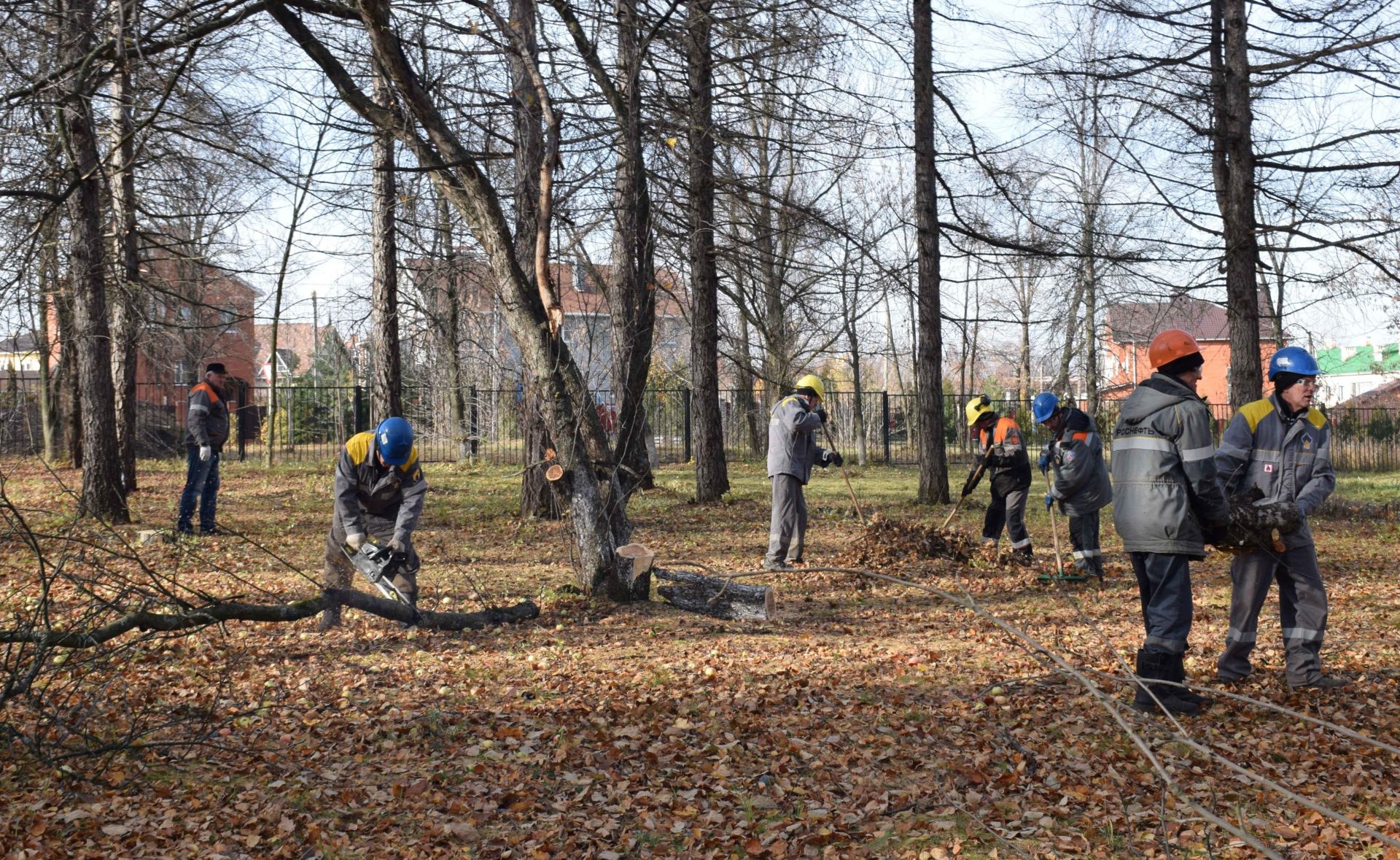 На работы по опиловке старых деревьев, вырубке сухих кустарников и очистке территории больницы от мусора выходит до 25 работников РНПК, задействуется заводская спецтехника: погрузчик, два самосвала, измельчитель древесных отходов на базе трактора.