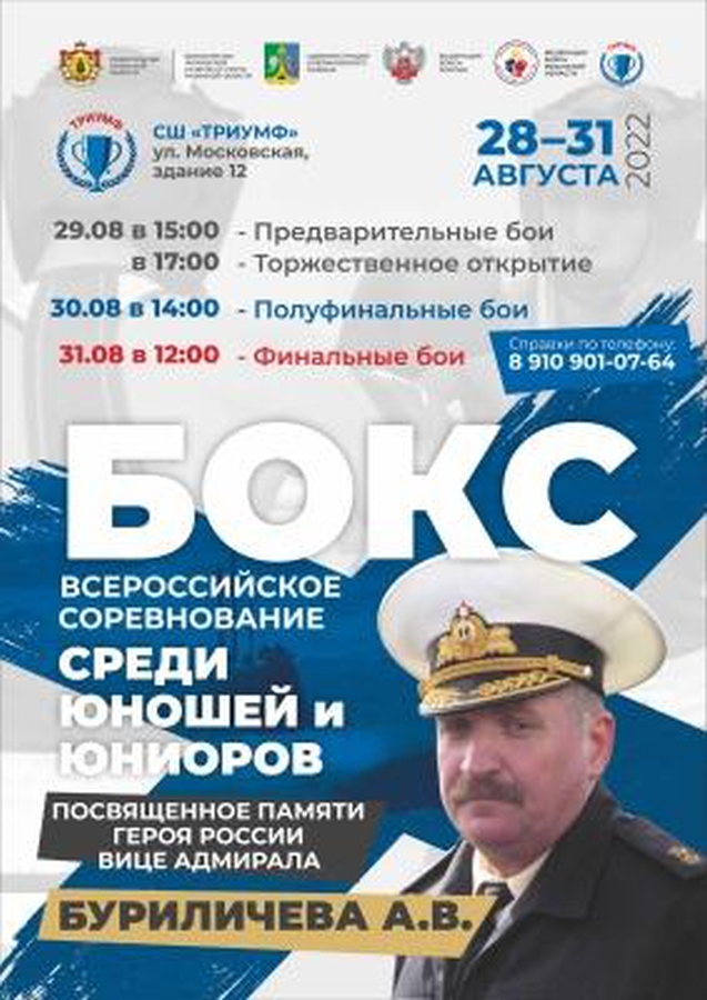 С 29 по 31 августа 2022 года в спортивной школе «Триумф» (г. Спас-Клепики) пройдут Всероссийские соревнования по боксу среди юношей и юниоров, посвященные памяти Героя России вице-адмирала А.В. Буриличева.