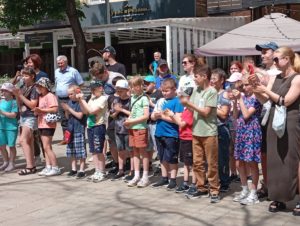 Праздничное настроение создавали выступления детских творческих коллективов и, конечно, шоу-дискотека мыльных пузырей с ростовыми куклами.