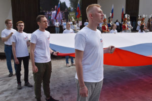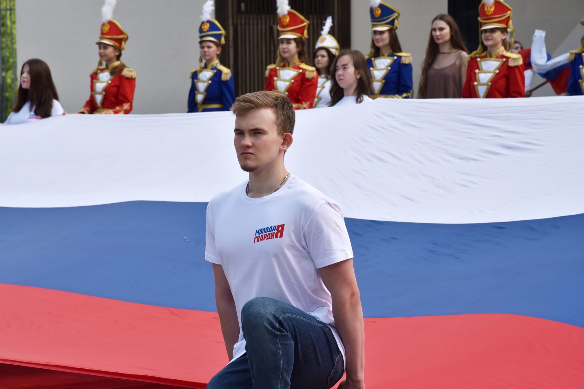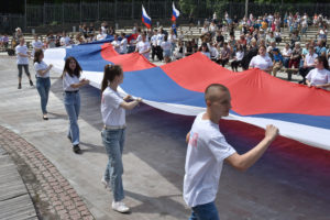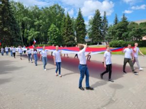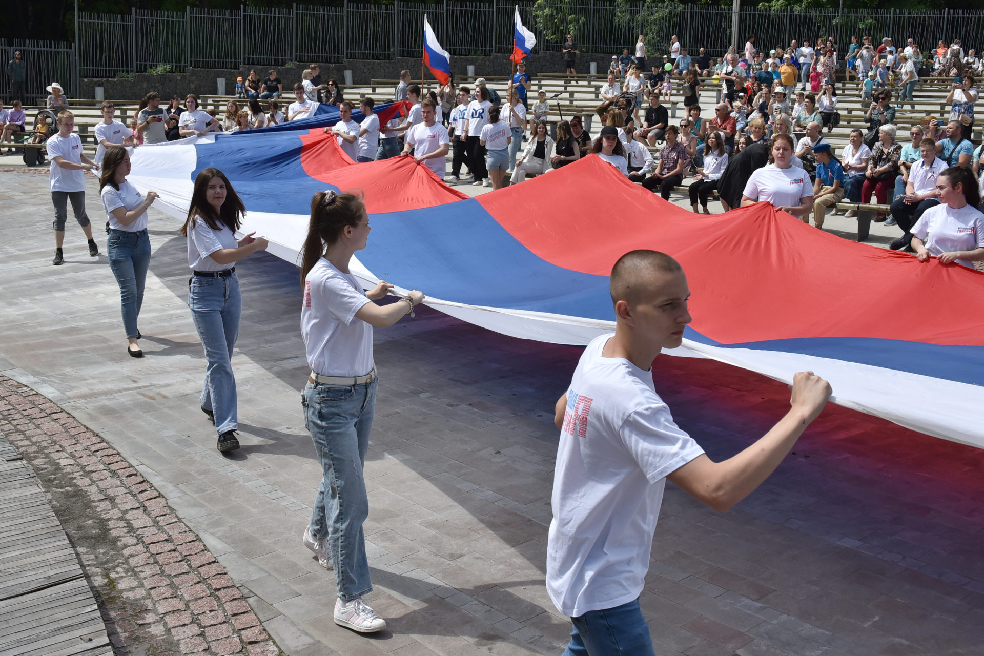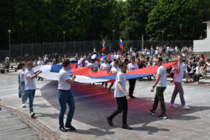 Полотнище размером 25×3,5 метра рязанцы вынесли к сцене Зеленого театры все вместе спели Гимн Российской Федерации, открыв торжества в честь главного праздника страны.