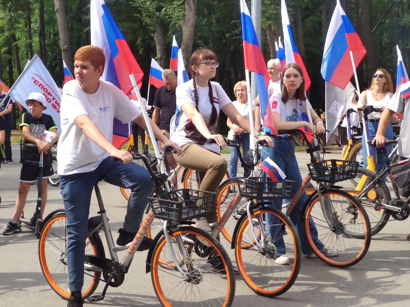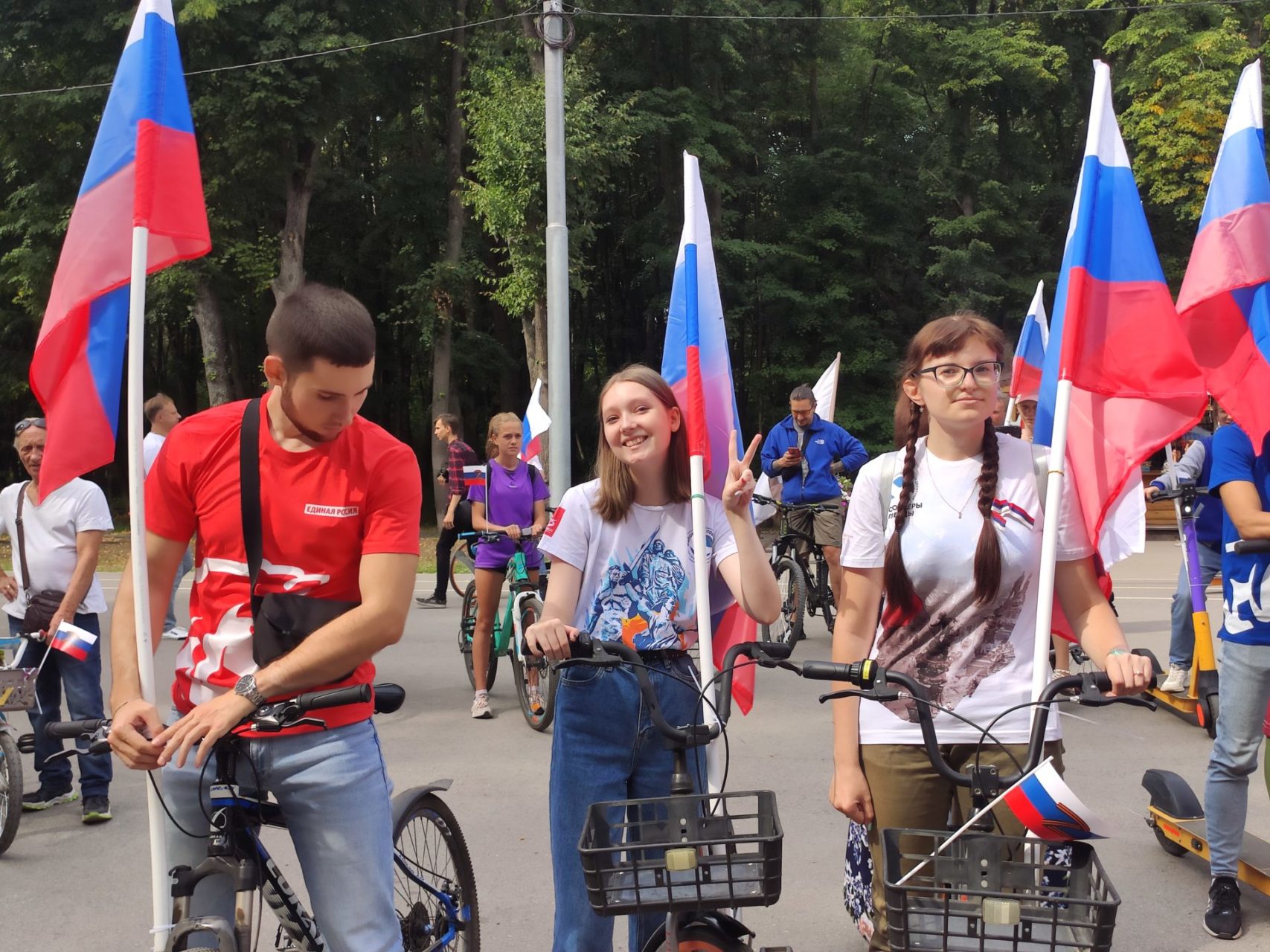 В Лесопарке прошел вело-самокатный пробег в рамках акции «Держи флаг по ветру». Она посвящена Дню государственного флага России.