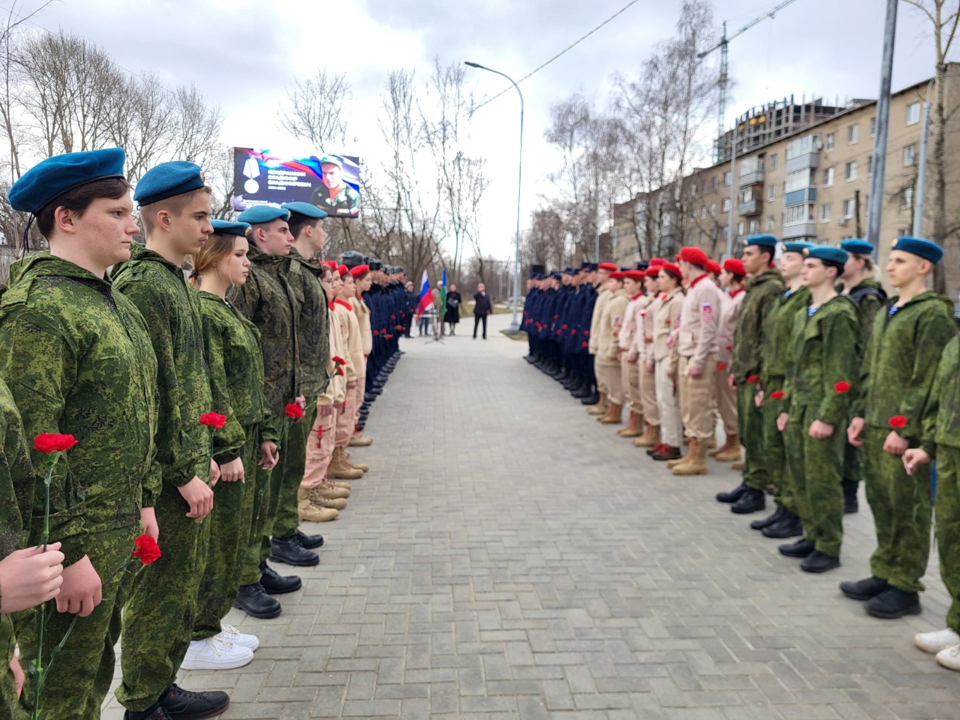 Смена фотоснимков проходит в торжественной обстановке при участии военнослужащих 137-го парашютно-десантного Рязанского ордена Красной Звезды полка, юнармейцев, родственников погибших ребят.