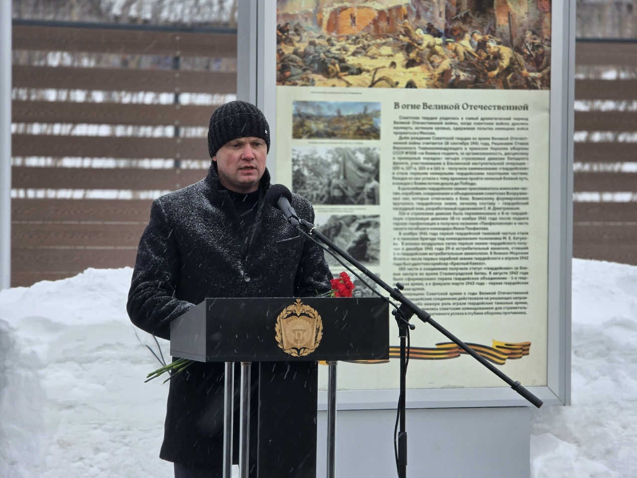 Временно исполняющий обязанности заместителя начальника по военно-политической работе РГВВДКУ имени генерала армии В.Ф.Маргелова, гвардии подполковник Роман Гусаков говорил о героизме наших бойцов в зоне проведения СВО и великой роли защитников Отечества в отстаивании интересов России.