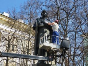 Преобразился памятник Константину Эдуардовичу Циолковскому на Театральной площади Рязани. Работники городских служб помыли его специальным составом.
