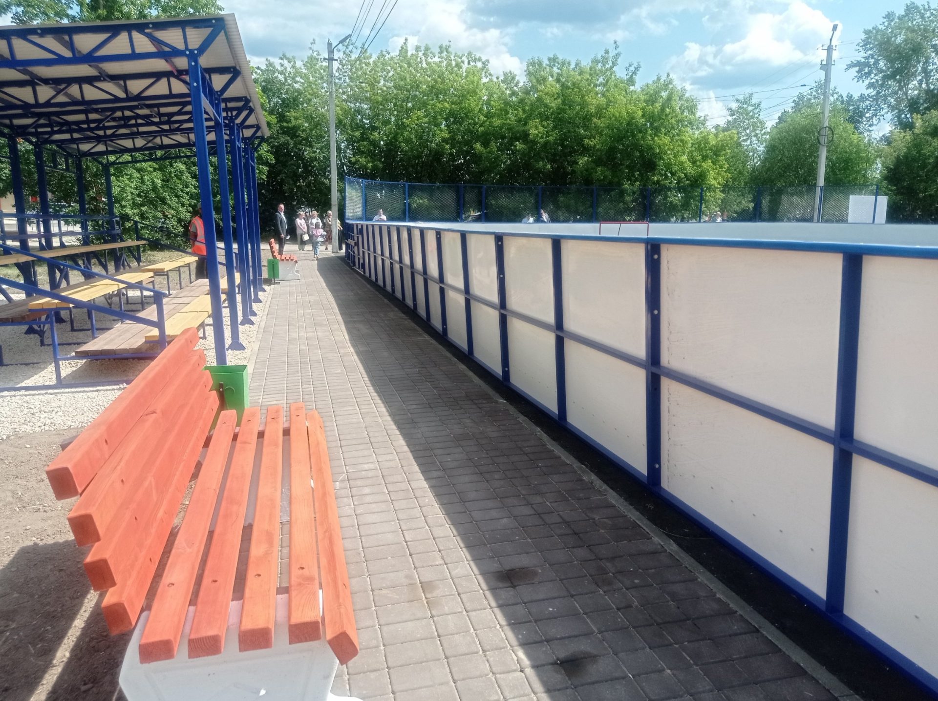 Благоустройство проводится в три этапа. В рамках первого этапа выполнены работы по устройству хоккейной площадки, установлена крытая трибуна, деревянная пергола, хоккейные ворота, скамейки, урны и светильники.