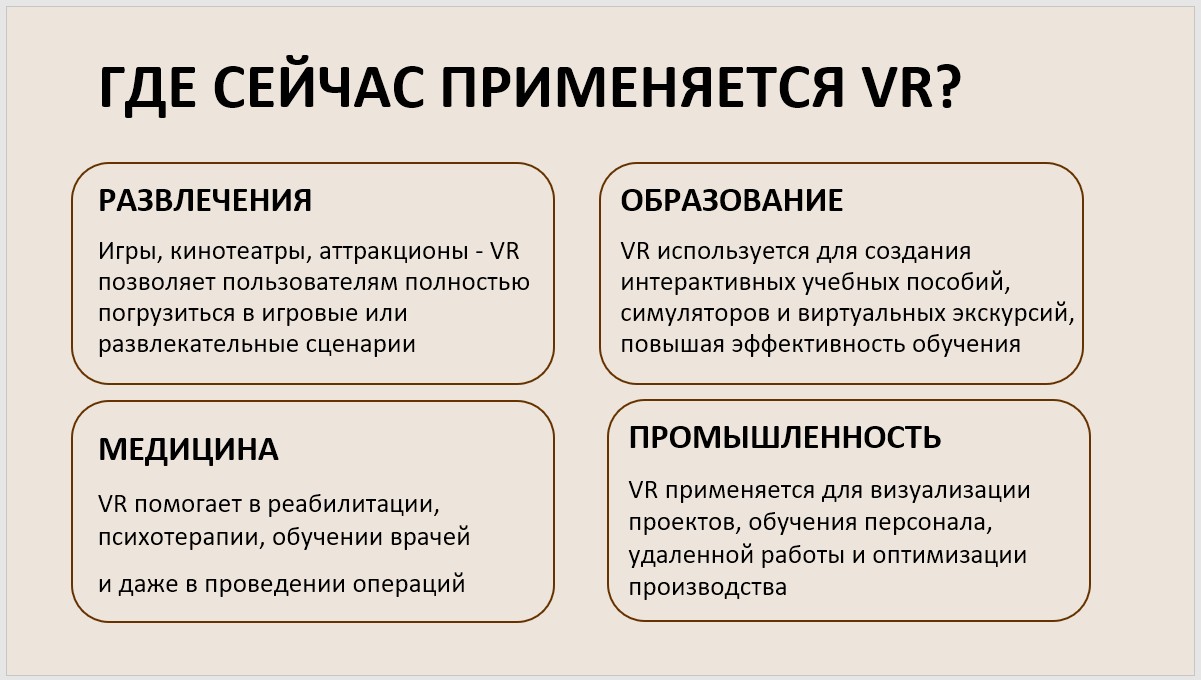 – в обучении технологии VR используются для создания интерактивных учебных пособий, симуляторов и виртуальных экскурсий, тем самым повышая эффективность подачи материала,