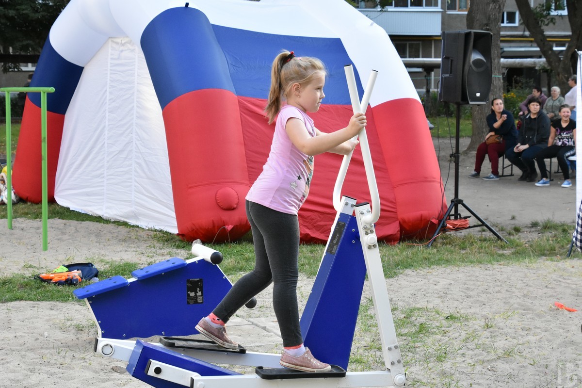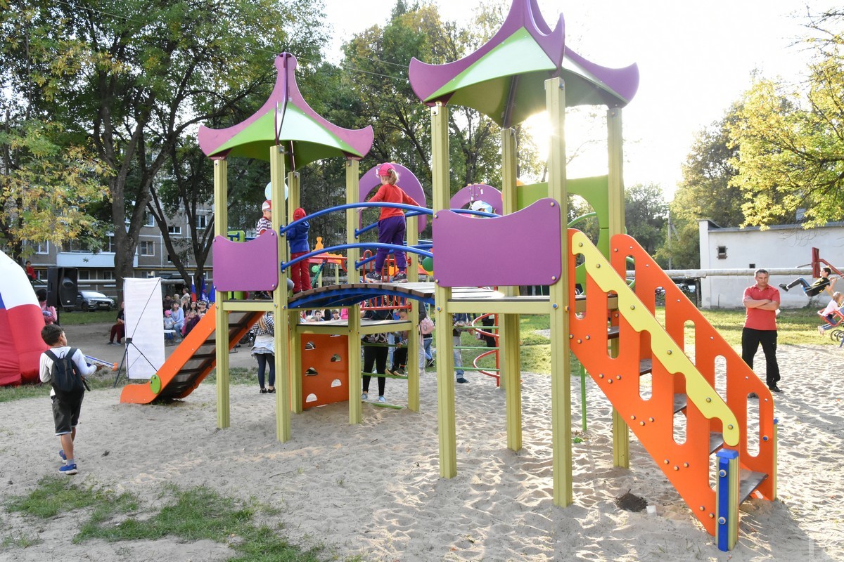 Благодаря работе местных жителей теперь вместо полуразвалившейся детской площадки во дворе красуется современное детское игровое оборудование (детский игровой комплекс, турнир, брусья, качели, уличные тренажеры).