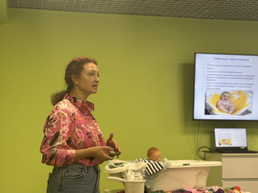 Кандидат медицинских наук, доцент кафедры детских болезней с курсом госпитальной педиатрии Валерия Петрова прочитала беременным лекцию о том, как правильно ухаживать за новорожденным.
