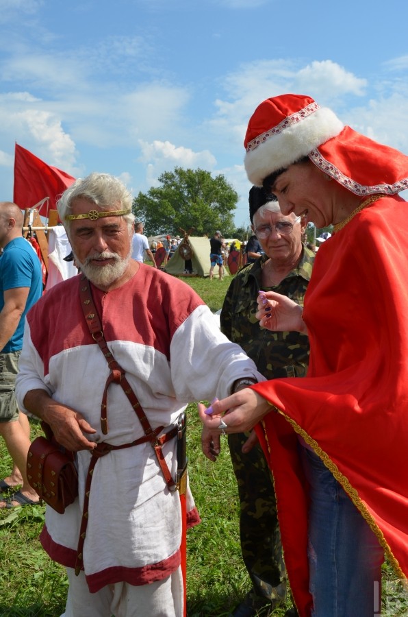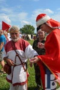 По дороге до площадок мероприятия обсуждается единственная интрига фестиваля – заявленный организаторами новый формат театрализованного представления. Но это еще впереди. Сейчас же на верхней площадке традиционно развернулись торговые ряды и интрактив. Наиболее многолюдно, как всегда, у шатра «Белого кречета». Посмотреть на костюмы предков в музее – интересно, но вот примерить такой костюм на себя – совсем иное. В центре действа, конечно же, Александр Николаевич Блинов – организатор и идейный вдохновитель историко-патриотического клуба, созданного 12 лет назад при Константиновском доме культуры. Он успевает и гостей радушно приветствовать, и указания детям раздавать, и со мною беседовать.