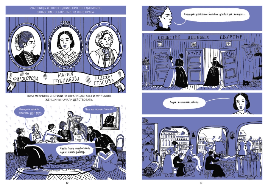 «Научные материалы о бестужевских курсах есть. А нам хотелось рассказать эту историю подросткам. Мне кажется, что у девочек должен быть пример женщин, которые учились, добивались успехов даже в XIX веке. Я как-то была в кафе, а рядом сидели девушки и говорили: «А зачем нам вообще учиться? Прикольно было бы просто вышивать, играть на фортепиано и больше ничего не делать». У меня это вызывает возмущение: ведь раньше девушки не просто «ничего не делали», у них не было ни прав, ни возможностей. И множество женщин приложили огромные усилия для того, чтобы мы могли получать образование, за этим стояла настоящая борьба. Их достижения несправедливо забыты, и мне хотелось бы хотя бы немного эту справедливость восстановить. Если ты будешь знать, каким трудом отвоевывалось это право, то будешь больше его ценить», – считает создательница книги Анна Русинова.