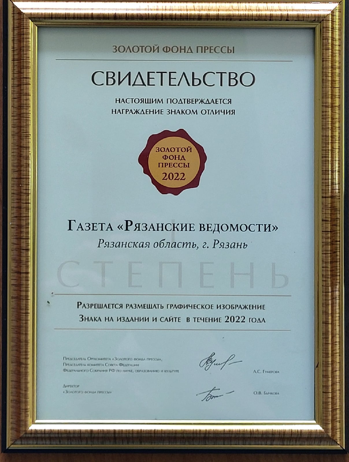 На форуме газете “Рязанские ведомости” был вручен Знак отличия “Золотой фонд прессы” первой степени- такую оценку поставили газете эксперты.