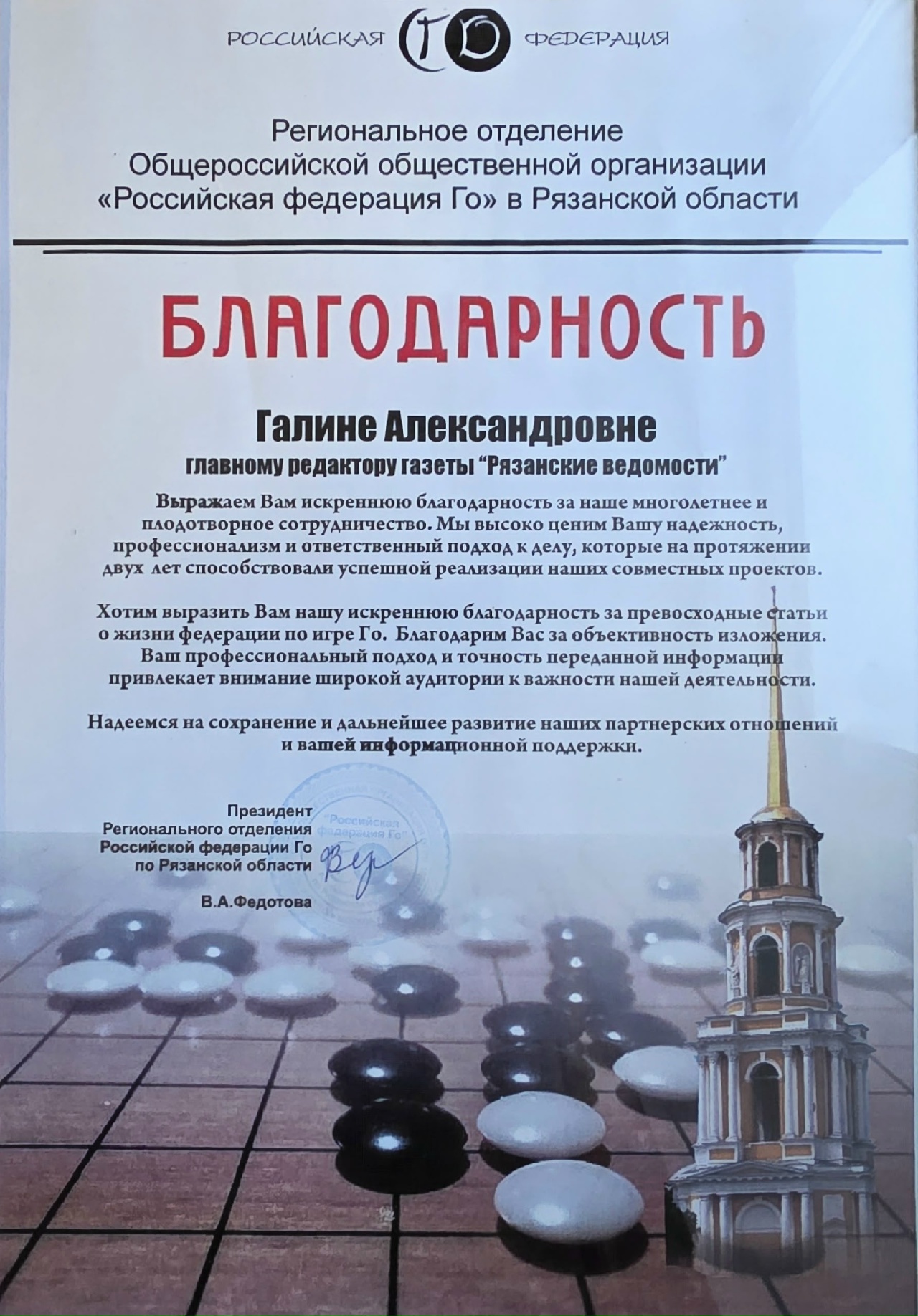 У редакции газеты «Рязанские ведомости» с федерацией Го сложились крепкие партнерские отношения, за что президент федерации Вероника Федотова поблагодарила главного редактора газеты, председателя регионального отделения Союза журналистов России Галину Зайцеву.