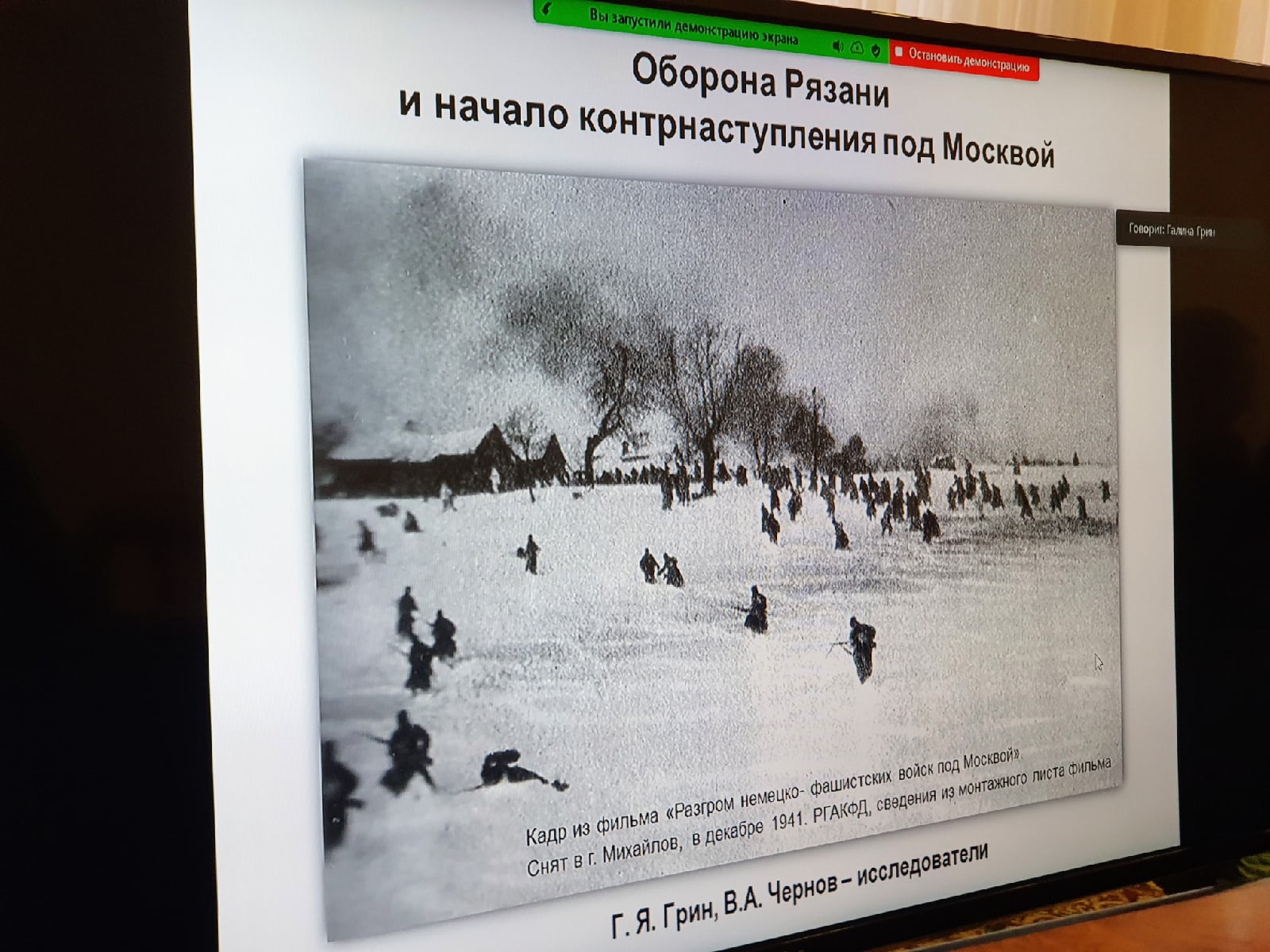 Об обороне Рязани и том, как происходящие на рязанско земле события связаны с началом контрнаступления под Москвой, рассказала историк Великой Отечественной войны, ведущий методист Центрального музея Великой Отечественной войны (с 2007 по 2018 г.) (г. Москва) Галина Грин. На слайдах были продемонстрированы карты и схемы, характеризующие действия военных по уничтожению фашистов на территории Захаровского и Михайловского районов. По словам Галины Грин, для более точного представления о положении дел на фронте необходимо изучать не только воспоминания генерала Ф.И.Голикова, но и другие источники.
