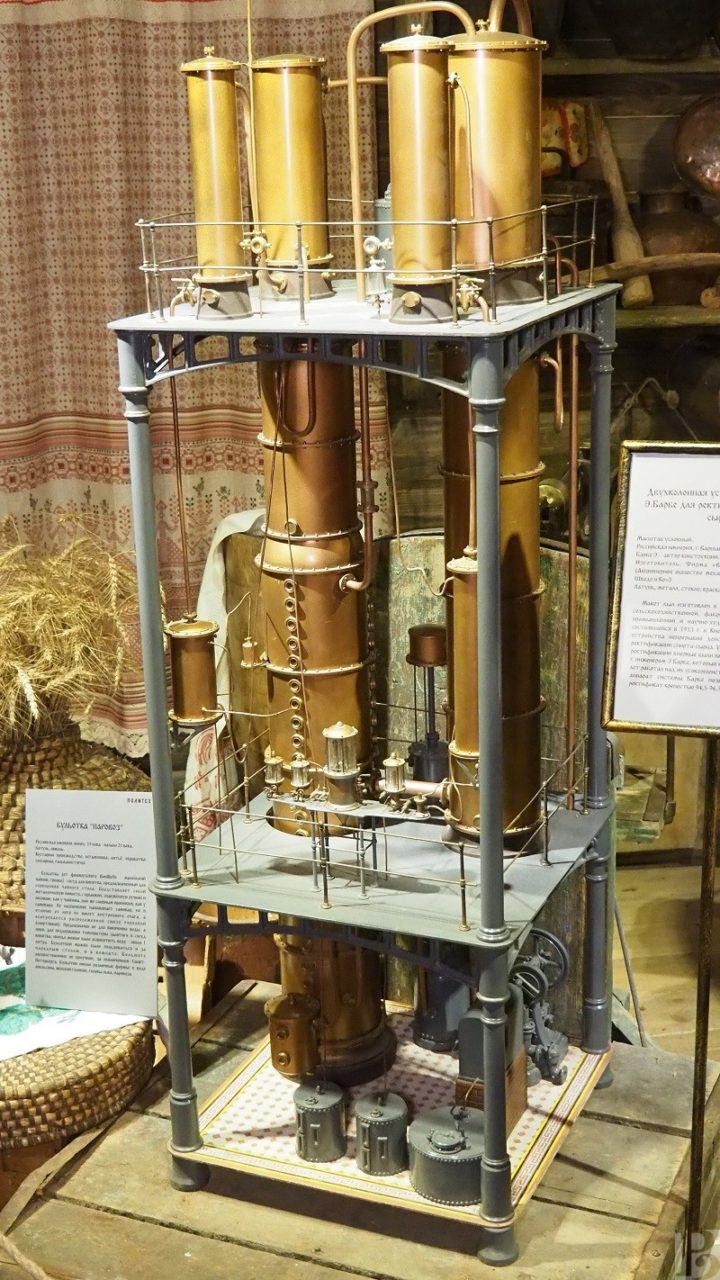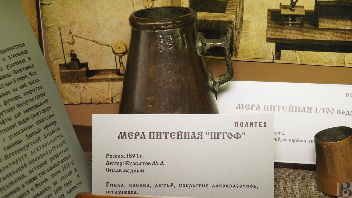 В экспозиции представлены старинные перегонные аппараты, их макеты, питейные меры, использовавшиеся на Руси. Скажем, мерный сосуд «Ведро» вмещал 12 литров 630 миллилитров, или ровно 20 современных бутылок вина. Штоф – это одна десятая ведра, ковш – его восьмая часть, около литра. Выпить чарку означало употребить всего одну сотую ведра, или 123 миллилитра напитка, то есть чуть больше половины стакана. С появлением в 1892 году спиртомера был введен стандарт крепости спиртного напитка – 38 градусов.