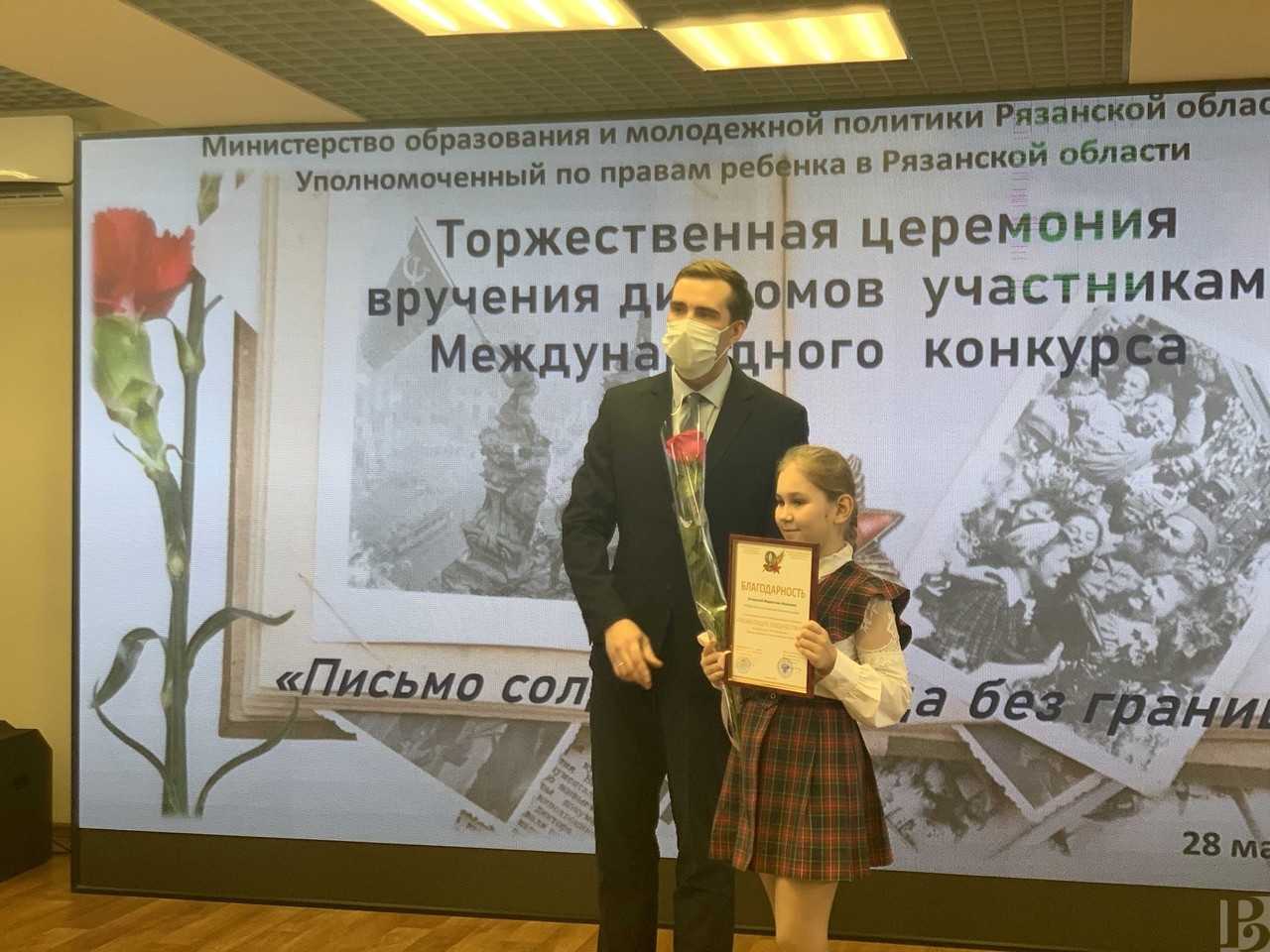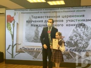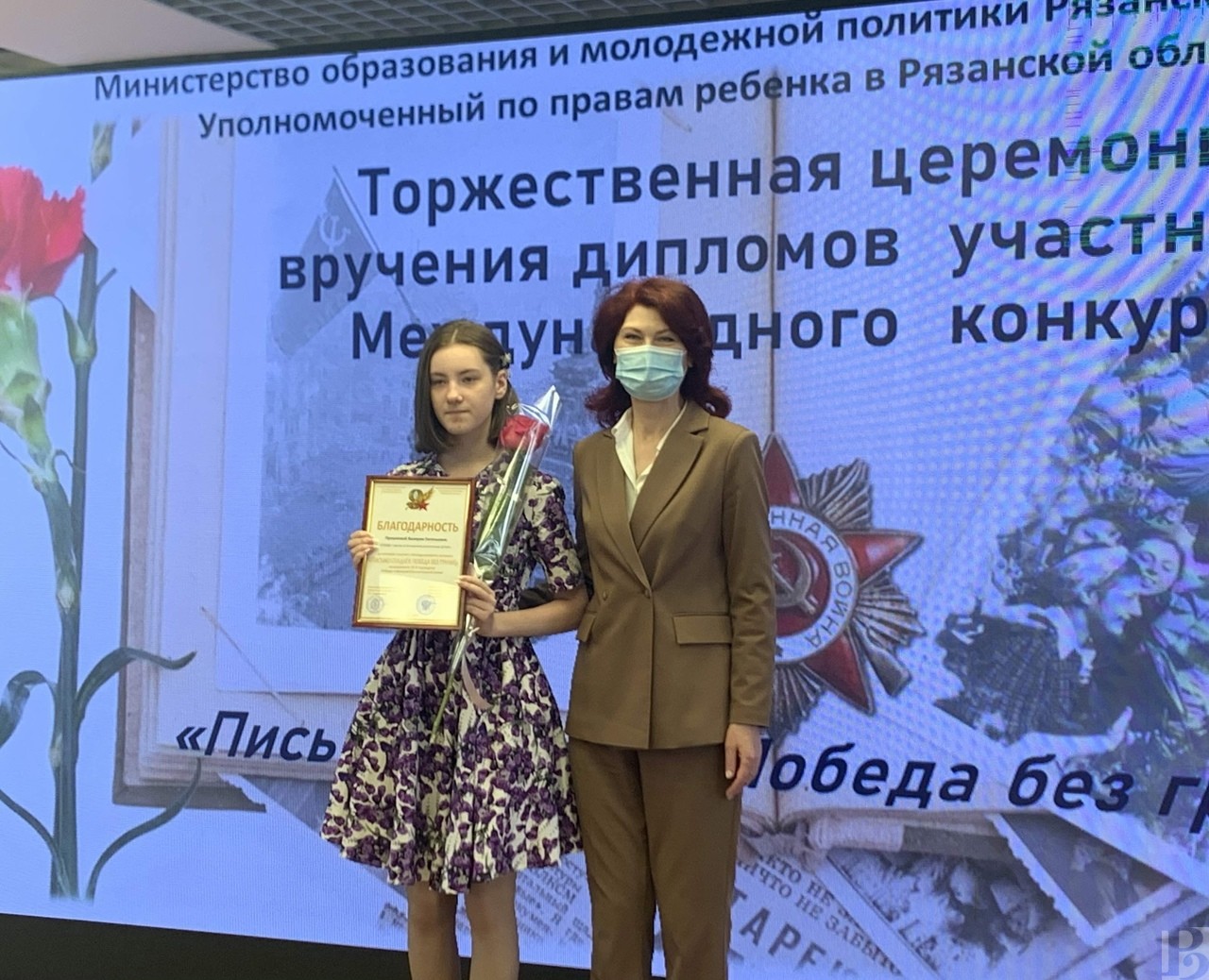 Церемония награждения прошла в региональном министерстве образования и молодежной политики. Уполномоченный по правам ребенка в Рязанской области Анжелика Евдокимова и заместитель министра образования и молодежной политики Александр Лощинин вручили дипломы за активное участие в конкурсе 12 школьникам региона.